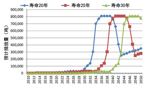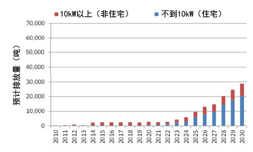 太陽能電池面板在使用20、25、30年時的預計廢置量(出處:日本環(huán)境省)