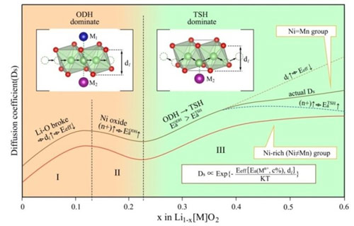 鋰離子電池作為一種清潔能源存儲器件,已在我們的日常生活中發揮著重要作用,比如電子器件、電動汽車和國防軍事等。三元材料是目前鋰離子電池廣泛應用的正極材料(如大多數手機和特斯拉電動汽車所采用的正極材料),也是新材料學院協同深圳企業正在開展的國家電動汽車動力電池重大創新工程的關鍵正極材料。隨著目前動力電池的需求越來越高,對鋰離子電池的功率密度提出了更高的要求。這就要求電池正極材料具有快速充放電的性能。影響鋰電池充放電速度最重要的因素是正極材料自身的鋰離子輸運機理(擴散路徑和擴散系數)。但是目前對于三元材料的鋰離子動力學性質及調控仍然缺乏深入而系統的研究,如何進一步優化三元材料的組分提高鋰離子擴散系數(兼顧結構穩定性和成本)是該領域仍未解決的一個重要問題。
