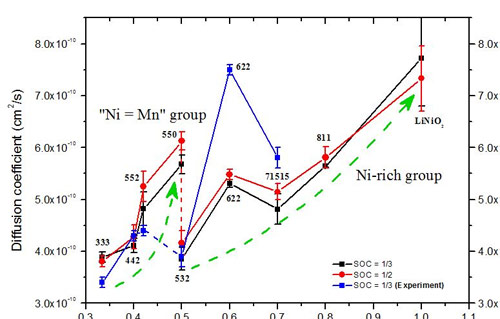 采用電化學的實驗測量一系列三元層狀正極材料的鋰離子擴散系數