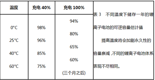 受熱或高充電電壓下也會使鋰離子電池承受更大的負擔,30℃(86°F)對于大多數鋰離子電池來說已經算是較高溫度了,4.10V/電池以上的電壓為高電壓。將充滿電的電池暴露在高溫下較長時間比電池循環次數增加對鋰離子的壓力還要大。表3表示了容量損失與溫度的函數關系。