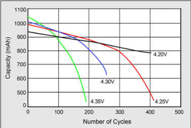 然而,較低的充電電壓往往會降低電池的容量。通常情況下,充電截止電壓每降低70mV,電池總的容量將會降低10%,而再升高到截止電壓時,則又會得到100%的容量。