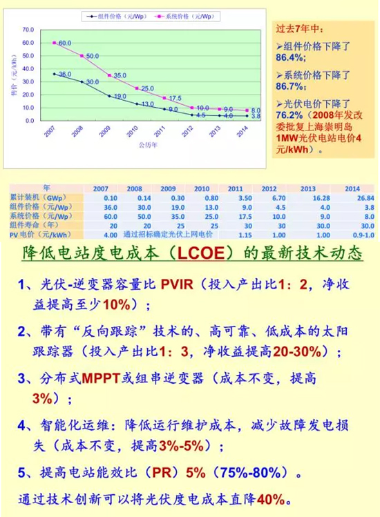 關(guān)于光伏組件和光伏系統(tǒng)成本下降情況,發(fā)改委能源研究所局研究員王斯成也在上述會議上提供了一些信息如下圖所示。