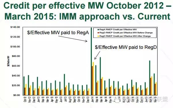 PJM市場的監(jiān)督機(jī)構(gòu)曾對PJM市場狀況進(jìn)行了過長達(dá)數(shù)季度的持續(xù)跟蹤。在其發(fā)布的名為MonitoringAnalytics的報告中指出,就單位有效兆瓦的快速調(diào)頻服務(wù)價格而言,PJM市場快速調(diào)頻服務(wù)的價格遠(yuǎn)低于常規(guī)調(diào)頻服務(wù)(約56%,如圖1所示)。與此同時,PJM市場的快速調(diào)頻容量只有402.2MW,因此快速調(diào)頻資源存在著過度采購的問題。
