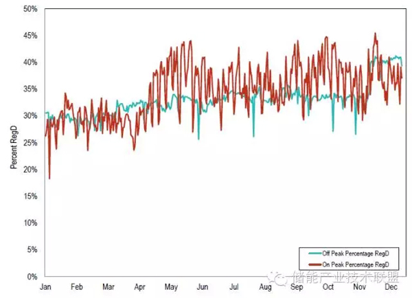 根據(jù)PJM電力市場的監(jiān)管要求,若要保證電力系統(tǒng)的正常運行,PJM市場應(yīng)當(dāng)具備700MW的高峰調(diào)頻資源和525MW的低谷調(diào)頻資源,同時快速調(diào)頻的可用容量應(yīng)當(dāng)達(dá)到237.3MW,其中高峰和低谷快速調(diào)頻資源分別為150-250MW和100MW。就2015年而言,在某些月份中快速調(diào)頻資源已經(jīng)占到總調(diào)頻資源的42%,有時甚至高達(dá)70%,快速調(diào)頻服務(wù)的價格在$20-50/MW之間(相當(dāng)于常規(guī)調(diào)頻服務(wù)價格的一半)。