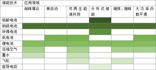 下表為各種儲(chǔ)能技術(shù)適用的領(lǐng)域:
