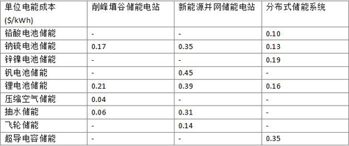 下表為各種儲(chǔ)能技術(shù)在各領(lǐng)域的單位電能成本比較: