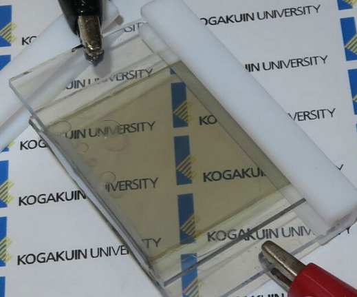 佐藤研究室此次展出了尚未發(fā)表論文的新裝置。新裝置對(duì)上述半透明鋰離子二次電池的材料略微做了變更,可將射入負(fù)極的光激發(fā)的電子直接用于電池充電。