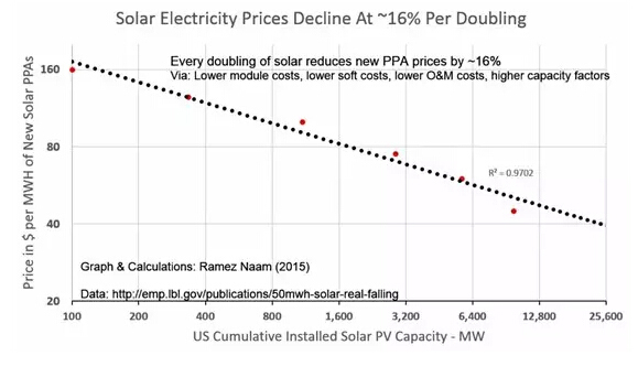 在美國(guó),太陽(yáng)能電力購(gòu)買(mǎi)協(xié)議里規(guī)定的電價(jià)在過(guò)去7-8年時(shí)間從200美元/MW(20美分/度)下降到現(xiàn)在的40美元/MW(4美分/度)。