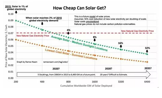 按照這樣的形勢(shì)發(fā)展,到2035年,太陽(yáng)能發(fā)電的電價(jià)將比新型煤電或者天然氣發(fā)電的電價(jià)的一半還要低,這還沒(méi)有包括煤電和天然氣發(fā)電防止空氣污染的成本以及碳排放費(fèi)用等。