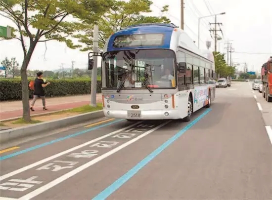 在韓國龜尾市的無線充電路段,純電動公交車可在行駛的過程中充電。