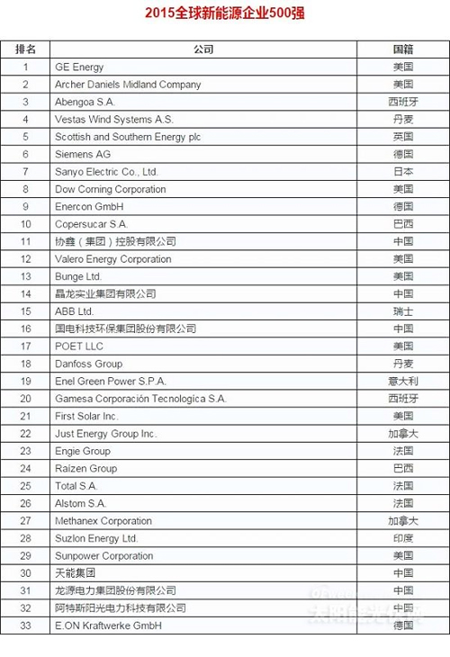 [摘要]日前,由中國能源報社主辦的“2015全球新能源企業500強發布會暨新能源發展高峰論壇”在京舉行,全球新能源500強名單出爐。