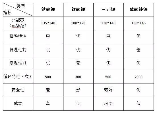 這三點是目前鋰離子電池的共性問題,所以鋰離子電池就像個矯情的小公舉,使起性子來就得“大保健”伺候著。但是不同的鋰離子電池中也存在差異性。我們通過一張表格來對比一下: