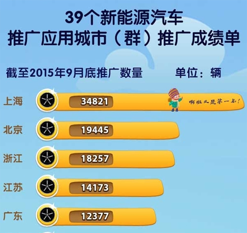 39個(gè)新能源汽車推廣應(yīng)用城市(群)至2015年9月的推廣成績(jī)單公布,上海高居推廣量和推廣完成率榜首,北京名列第二。