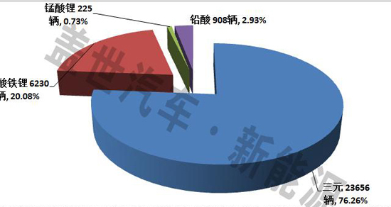 從圖2可以看出,磷酸鐵鋰動(dòng)力電池是純電動(dòng)客車的動(dòng)力主流,三元材料動(dòng)力電池份額位居第二。