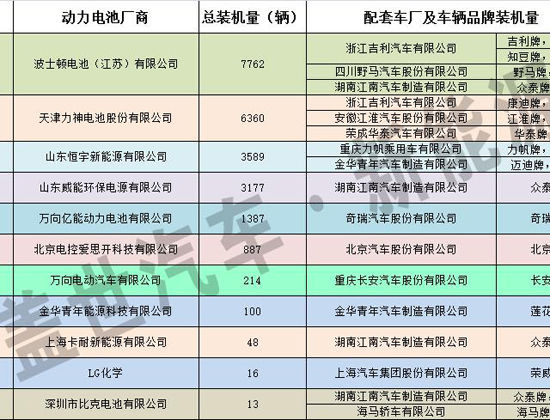 山東威能環(huán)保電源公司排在第四名,主要為湖南江南汽車制造公司生產(chǎn)的眾泰牌電動(dòng)車配套,當(dāng)月裝機(jī)量為3177輛。