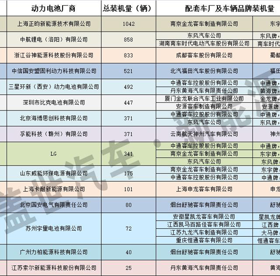 表2是為11月份生產(chǎn)的純電動(dòng)客車提供三元?jiǎng)恿﹄姵氐闹饕?yīng)商。從中可以看出,排在第一名的上海正昀新能源技術(shù)有限公司當(dāng)月三元?jiǎng)恿﹄姵氐难b機(jī)量為1042輛,主要配套車廠是南京金龍;第二位的中航鋰電當(dāng)月裝機(jī)量為858輛,主要配套車廠是東風(fēng)汽車和南車時(shí)代電動(dòng);第三名的浙江谷神能源科技股份有限公司的裝機(jī)量為833輛,主要配套車廠是成都客車股份有限公司;第四名中信國(guó)安盟固利的裝機(jī)量為521輛,主要為北汽福田配套;第五名的三星,裝機(jī)量為492輛,主要為中通客車和丹東黃海兩家車廠配套。