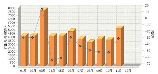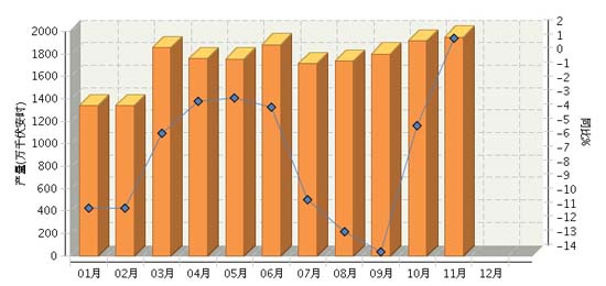 2015年1~11月,全國堿性蓄電池行業累計完成產量同比增長-29.37%。其中:11月份完成產量同比增長-26.93%。2015年全國堿性蓄電池行業月度產量及同比如上圖所示。
