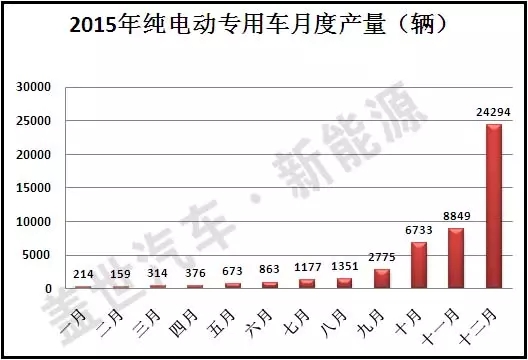 得益于國家政策和地方政策,純電動專用車的發展更加給力。其中1月份產量為214輛,2月份159輛,3月份314輛,4月份376輛,5月份673輛,6月份863輛,7月份1177輛,8月份1351輛,9月份2775輛,10月份6733輛,11月份8849輛,12月份24294輛。環比增長率分別為﹣26%、98%、20%、79%、28%、36%、15%、105%、129%、31%、175%。