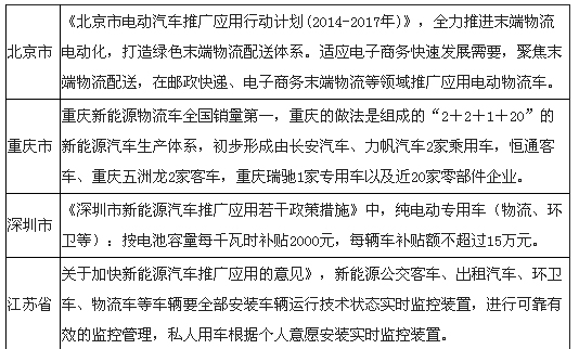 過去幾年,全國各地許多地方都出臺了純電動物流車推廣方案,北京、天津等九大省市的新能源汽車推廣方案紛紛落地,推廣方案中均提及將推廣純電動物流車。2016年,各地將出臺新政,或延續去年新能源物流車政策。以下是各地純電動物流車政策匯總: