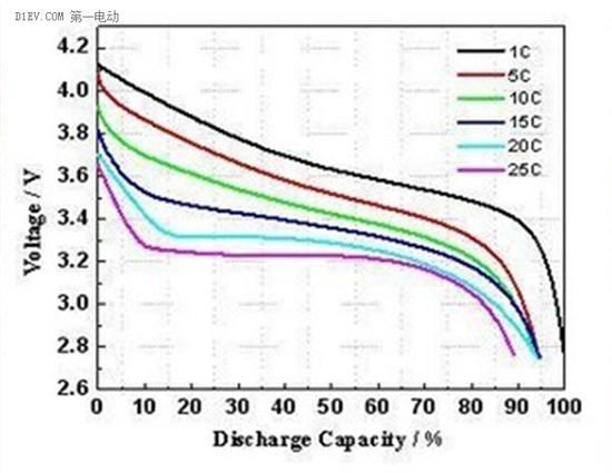 這個(gè)是三元材料的不同電流倍率的放電圖,這個(gè)1C就是前面提到的1I1(A),5C就是5I1(A),倍率越大,相同容量比率下的電壓越低,在橫軸上也越短,也就是容量越低。圖里面最低的倍率1C和最高倍率25C之間,橫軸上的容量比率差了10%以上。急加速急減速,也就意味著電機(jī)要轉(zhuǎn)更快,需要電池給它更多的電,結(jié)果有幾個(gè)百分點(diǎn)的電就放不出來(lái)。