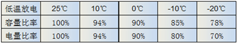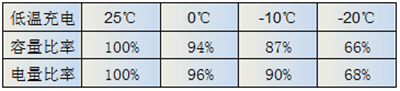 表中展示了低溫下放電的電量變化情況,從常溫25度到-20度,放出的電量降低30%。低溫下充電也有類似現(xiàn)象。