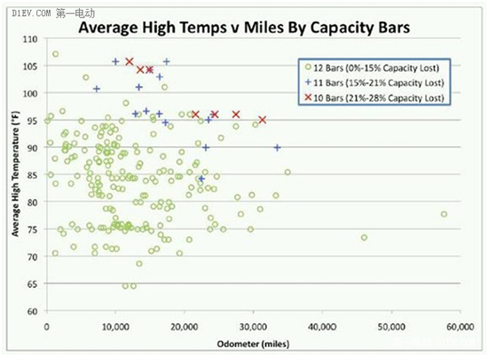 上面這張圖是美國(guó)電動(dòng)汽車協(xié)會(huì)調(diào)研特斯拉Roadster的衰減數(shù)據(jù)。圖表名稱可以譯為:平均最高溫度與行駛里程對(duì)電池容量影響的關(guān)系;橫軸是行駛里程,單位:英里;縱軸是平均最高溫度,單位:℉(單位:華氏度,為了大家理解方便,小編換算了一下,縱軸表示的溫度范圍為15.6℃-34.7℃,這里的溫度應(yīng)該是環(huán)境溫度);圖例中Capacity Lost的意思是電池容量的損失。顯而易見(jiàn),此圖標(biāo)呈現(xiàn)了兩個(gè)趨勢(shì),一是行駛里程越長(zhǎng),衰減越大;二是溫度越高,衰減越大。行駛里程和溫度是兩個(gè)很重要的影響因素。