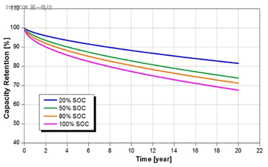 第二張圖展示了電池或車輛正常存放時(shí)的衰減情況。圖表的橫軸為存放時(shí)間,單位:年;縱軸為電量保持率;圖例分別為開始存放時(shí),電池內(nèi)所剩電量的SOC參數(shù)值。正說(shuō)明了即使車輛不運(yùn)行正常存放時(shí),電池的電量也會(huì)逐漸衰減。存放時(shí)要注意的是,電池不能在完全放空電時(shí)存放,避免可能的過(guò)放電。