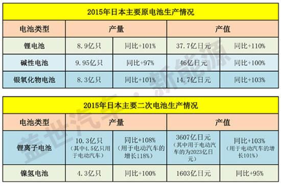 2015年1-12月,日本電池(包括原電池和二次電池)總產量超過43億只,總產值逾8075億日元(約463億元人民幣),產量和產值與上年同期相比均實現101%的增長幅度。