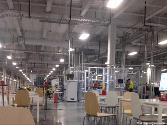 生產(chǎn)區(qū)廣角鏡頭。能看到忙碌的工人,以及一些貌似用來(lái)休息的桌子和椅子。