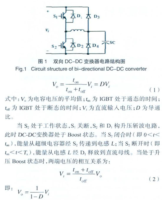 雙向DC-DC變換器是直流母線和超級(jí)電容器之間的一個(gè)周期性通斷的開(kāi)關(guān)控制裝置,它的作用是改變供給超級(jí)電容器的電壓,實(shí)際上是作為一個(gè)電壓調(diào)節(jié)系統(tǒng)而工作的。