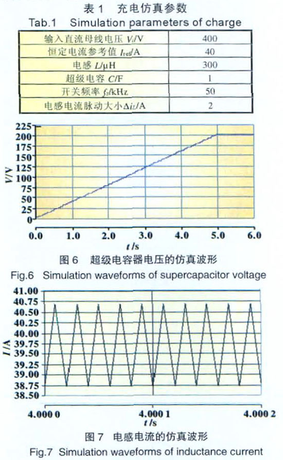 由圖6可見(jiàn),對(duì)超級(jí)電容器進(jìn)行恒定的大電流充電,其電壓隨時(shí)間近似直線上升直至飽和,這種電壓隨時(shí)間大幅度上升表明超級(jí)電容器可以在短時(shí)間內(nèi)吸收高能量。由圖7可見(jiàn),采用PI補(bǔ)償環(huán)節(jié)可以得到僅有5%脈動(dòng)的較為恒定的充電電流,同時(shí)使系統(tǒng)較開(kāi)環(huán)時(shí)穩(wěn)定。