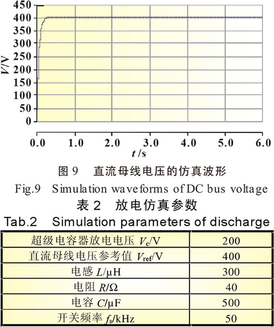 在PSCAD/EMTDC電力系統(tǒng)仿真軟件中建立了超級(jí)電容器以電壓為控制量的恒壓放電仿真模型。仿真參數(shù)見(jiàn)表2。仿真圖形見(jiàn)圖9。