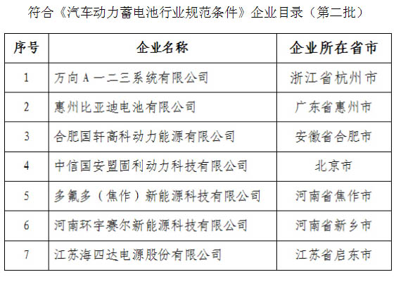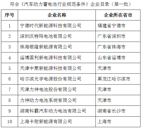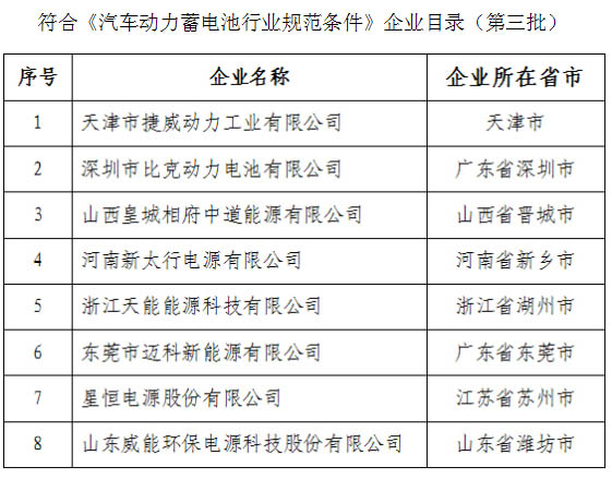4月6日,工信部裝備工業司對第三批符合《汽車動力蓄電池行業規范條件》的企業名單進行公示,共8家企業上榜。加上此前公布的第一批10家和第二批7家企業,目前共有25家企業進入汽車動力蓄電池行業規范名單。具體名單如下: