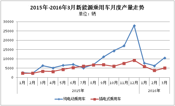 2016年新能源乘用車銷量受開年淡季的影響,經過前兩月的連續下滑,在3月開始出現上漲趨勢。據乘聯會數據統計,2016年3月新能源乘用車銷量達1.56萬輛,環比增長55%,與去年同期相比增長60%。截至目前,第一季度累計銷量已達3.95萬輛,同比增長超過1倍,實現月均1.3萬輛左右的銷量水平。