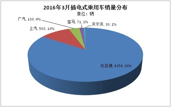 細分看,3月銷量增長幅度最大的當數比亞迪,由2月1217輛的水平攀升至3月3000多輛的水平,環比增幅達1.5倍。其中比亞迪純電動乘用車車型逐步豐富,新推出的比亞迪秦EV3月銷量也達229輛,此外,比亞迪e6、e5、騰勢銷量都有提升,e6也由2月1105輛的銷量提升至3月2061輛的水平??傮w看,純電動乘用車銷售比例在比亞迪企業內部逐步加大,與插電式混合動力乘用車比例基本持平,各占50%。